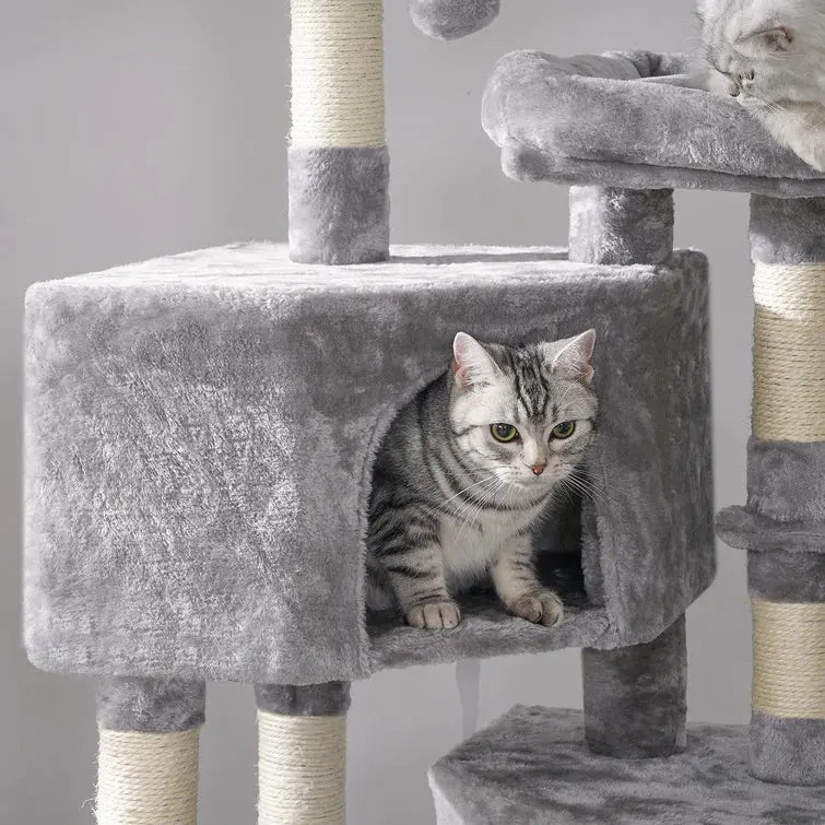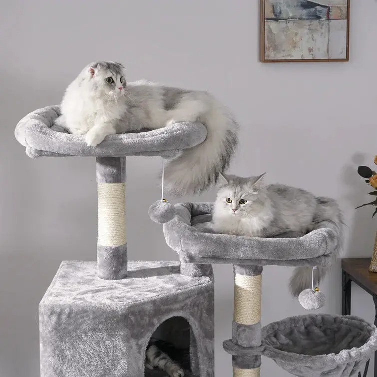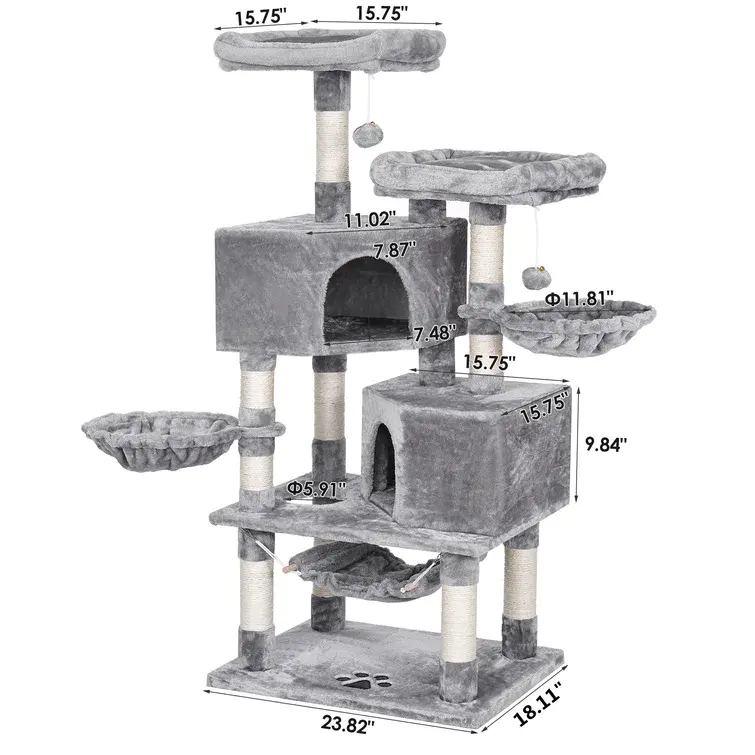 Pet Cat Tree Tower is composed of good quality plush material, giving your cats a soft and comfortable touch in their estate. Nicely cushioned perches, spacious houses, sisal scratching posts, several layer design, cozy baskets and hammock, jingly balls will provide a lot of lounging room and fun to your kitties. They can watch birds and squirrels on the perches, take a nap in the condo, jump up and down, play with toys, or explore around in their castle. Solid construction with a balanced design and strong base ensures your fur babies being safe as well as having fun from this cat stand. The cat climber in smoky grey color will also match the furniture of your room. It will be a great tree for all-size cats. Your cats will love their new castle!