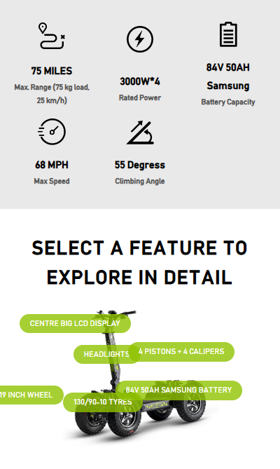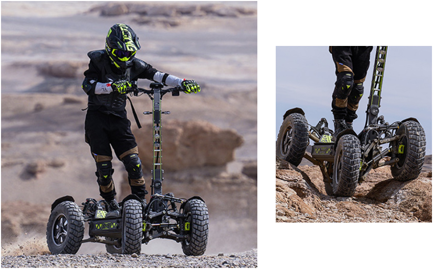 GT4S is born for off-roading and pursues the joy of conquering. Equipped with cutting-edge 4X3000W high-power motors, it boasts unparalleled power and performance, the maximum peak output is 14000W, and the top speed can reach 110km/h. In various terrains such as rocks, deserts, beaches, and forests, it can easily cross obstacles and never stop.